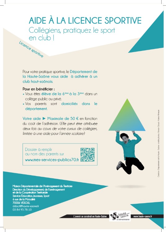 Ce dispositif permet aux jeunes collégiens, domiciliés en Haute-Saône et licenciés dans un club du département, de recevoir une subvention pour leur adhésion à un club sportif. Cette aide, calculée sans condition de ressources, couvre 50 % du coût de l'adhésion, dans la limite de 50 €.