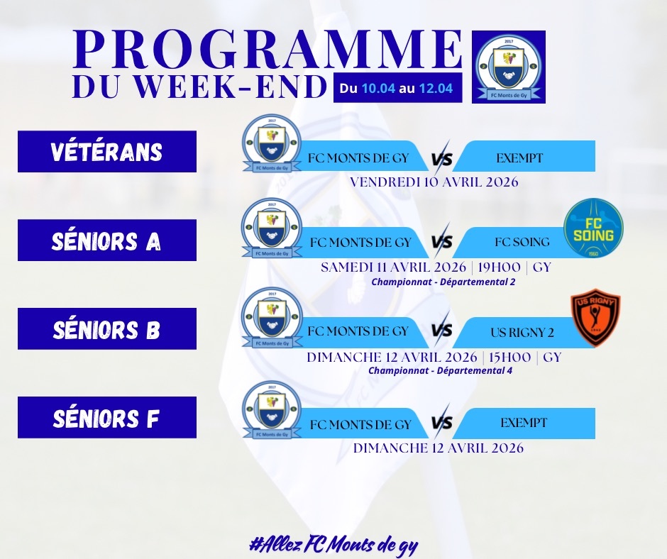 Nos autres équipes (Vétérans, Séniors F, U18, U15, U15F, U13, U11, U7) seront exemptes ce week-end.