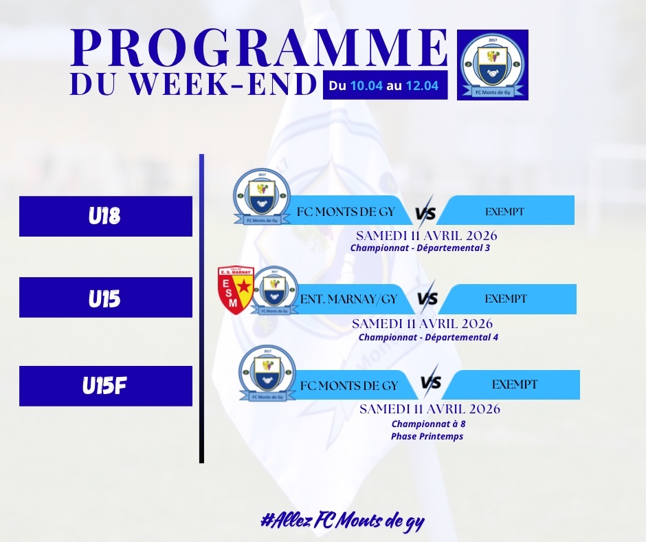 Nos autres équipes (Vétérans, Séniors F, U18, U15, U15F, U13, U11, U7) seront exemptes ce week-end.